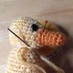 If you repeat step 2 till 4 for the complete muzzle or beak, you have it sewed on exactly as it looks when pinned on. Because you have sewed behind the crochet loops, the stitches you’ve just made are barely visible. Now you can decide if and which stitches need to be tighter, so the muzzle blends in better. You can stitch them the way you like to.