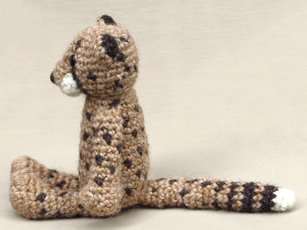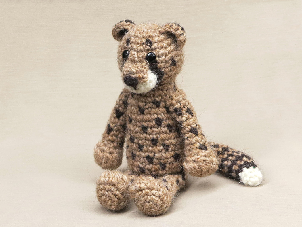 Poochey and his cardigan are made with Istex Lett Lopi, a 100% wool with a lot of fuzziness. If you use the recommended yarn, he will be 7 inch / 17 cm high. I would strongly recommend a fuzzy yarn, because it hides the seams of the colour changes.