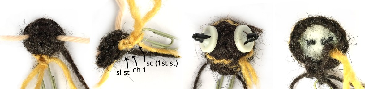 Make the eyes by attaching the yarn at the side of the head, between round 2 and 3. Ch 3 st, in 2nd ch from hook sl st and weave in the yarn ends as shown in the image. You can embroider the mouth between round 1 and 2.