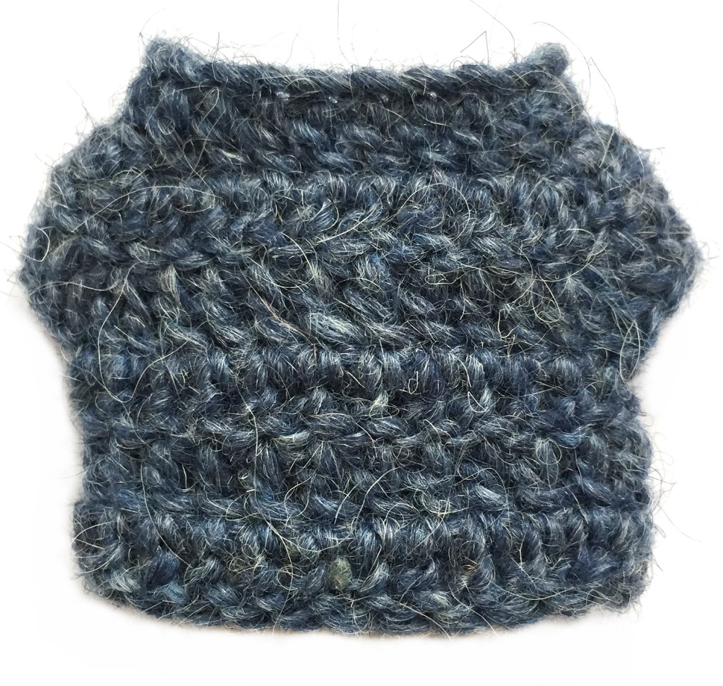 Poochey and his cardigan are made with Istex Lett Lopi, a 100% wool with a lot of fuzziness. If you use the recommended yarn, he will be 7 inch / 17 cm high. I would strongly recommend a fuzzy yarn, because it hides the seams of the colour changes.