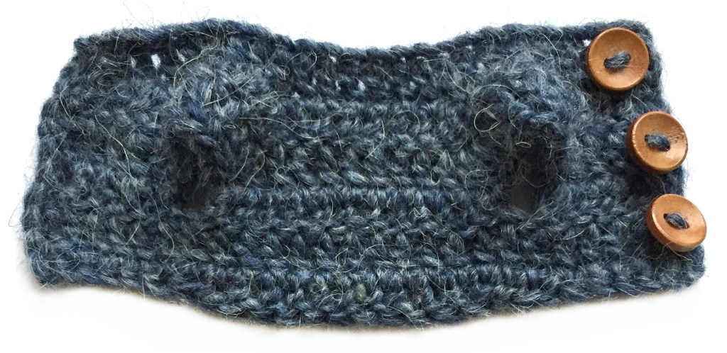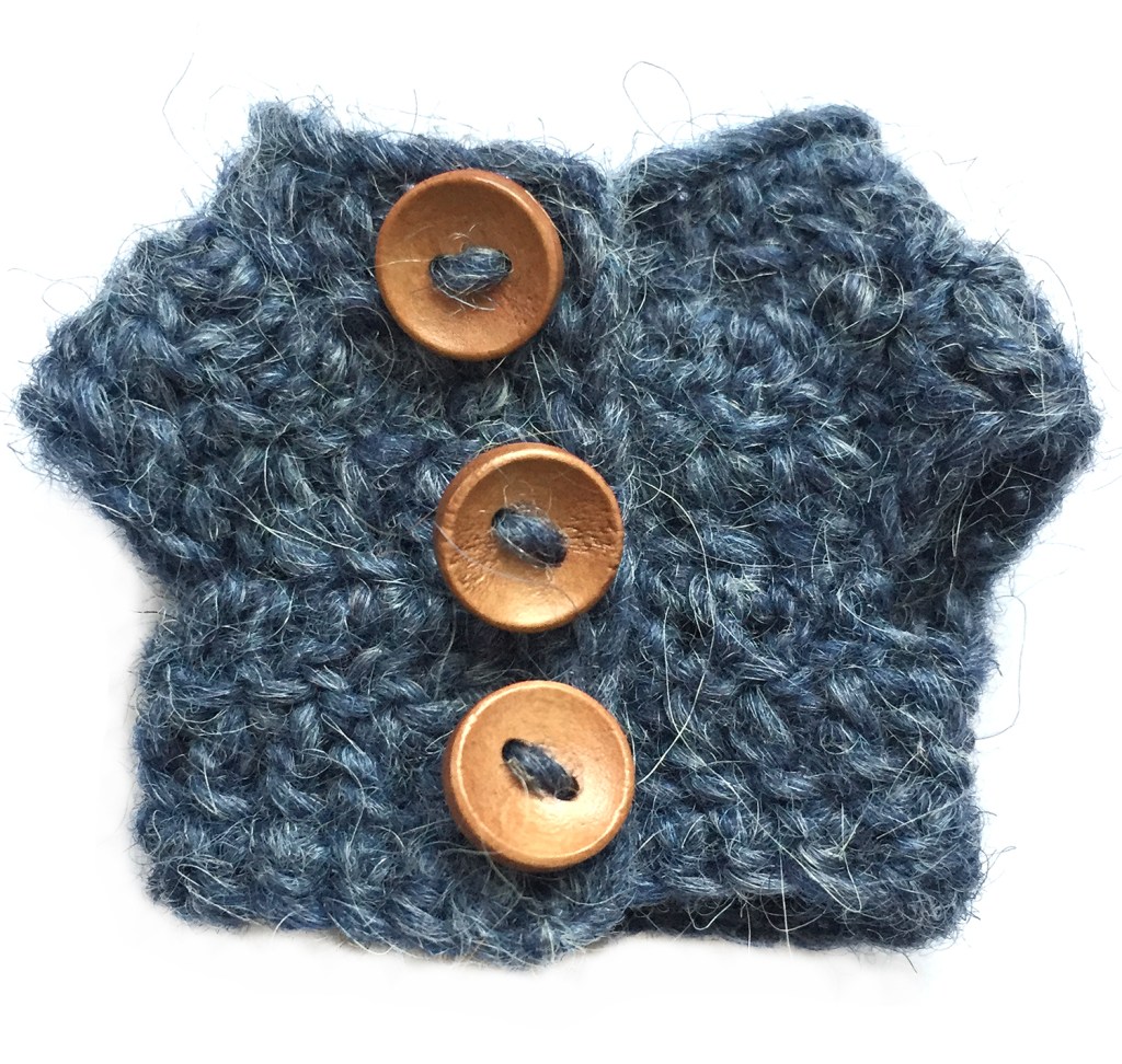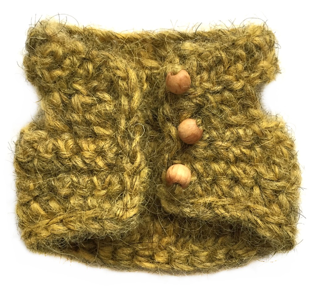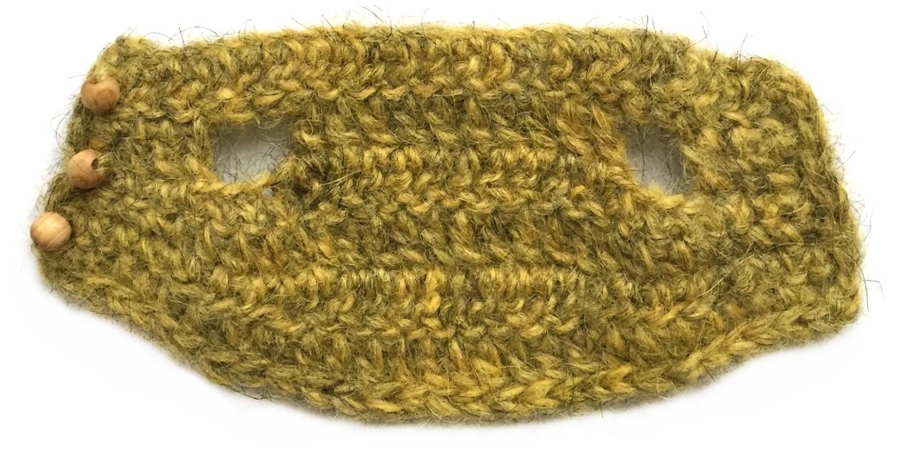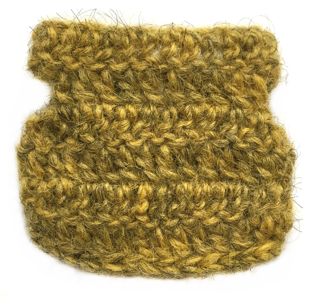 Make two for each bumblebee, use the thinner yarn with the same hook. If you use Lopi yarn but don’t have the Einband weight, split a lopi strand in half. Make the starting chain as long as the end, so you can use both ends together to attach the wings.