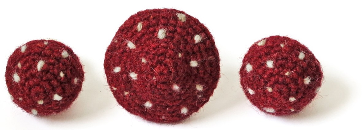 This pattern is written in standard American crochet terms. It’s useful to read it before you start. If you use the recommended yarn, your toadstools will be 9 cm / 3.5 inch high (wide version) and 7 cm / 2.8 inch high (small round version).